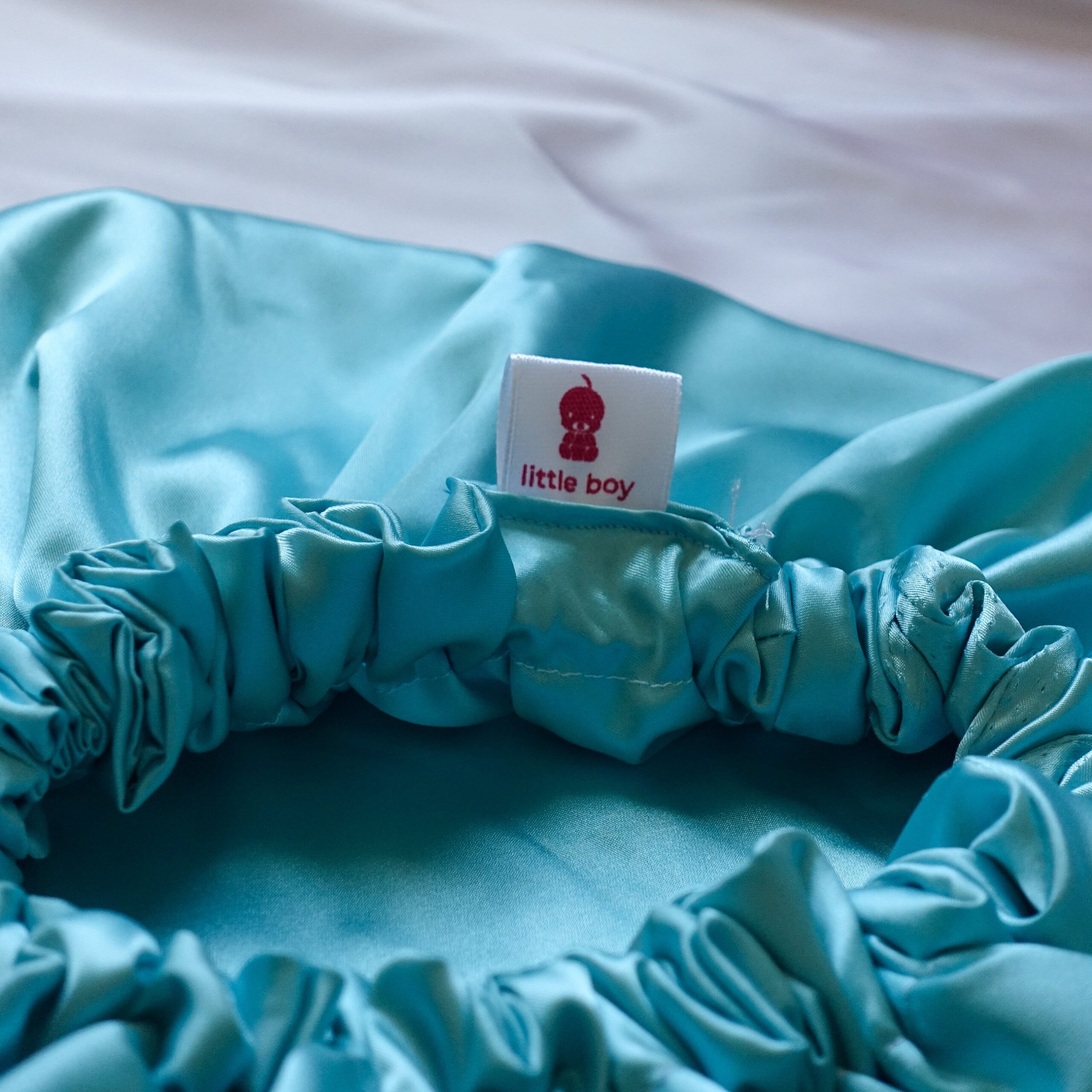 bonnet en satin doublé bleu tres doux pour les cheveux